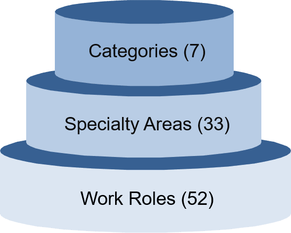 - Work Roles – The most detailed grouping of cybersecurity work comprises specific knowledge, skills, and abilities (KSAs) required to perform tasks in a work role.